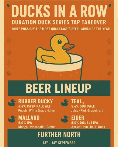 Includes first pours of Eider Duration’s first solo release Double IPA, Rubber Ducky a Session IPA at ‘select’ venues and the return of Teal a Double Dry Hopped Pale Ale and Malllard IPA.